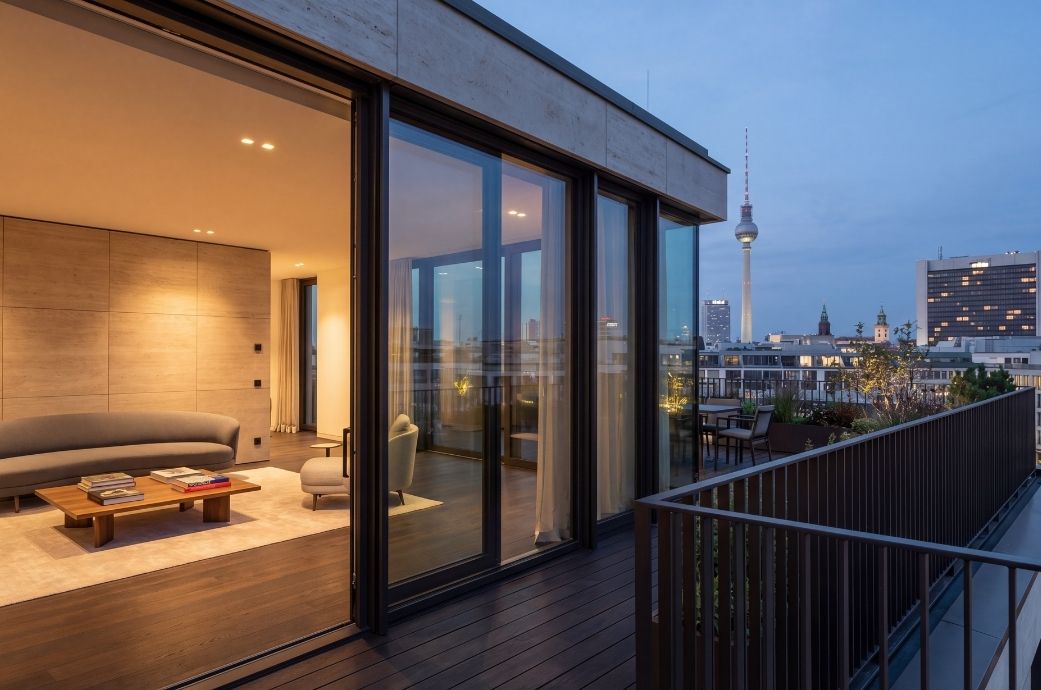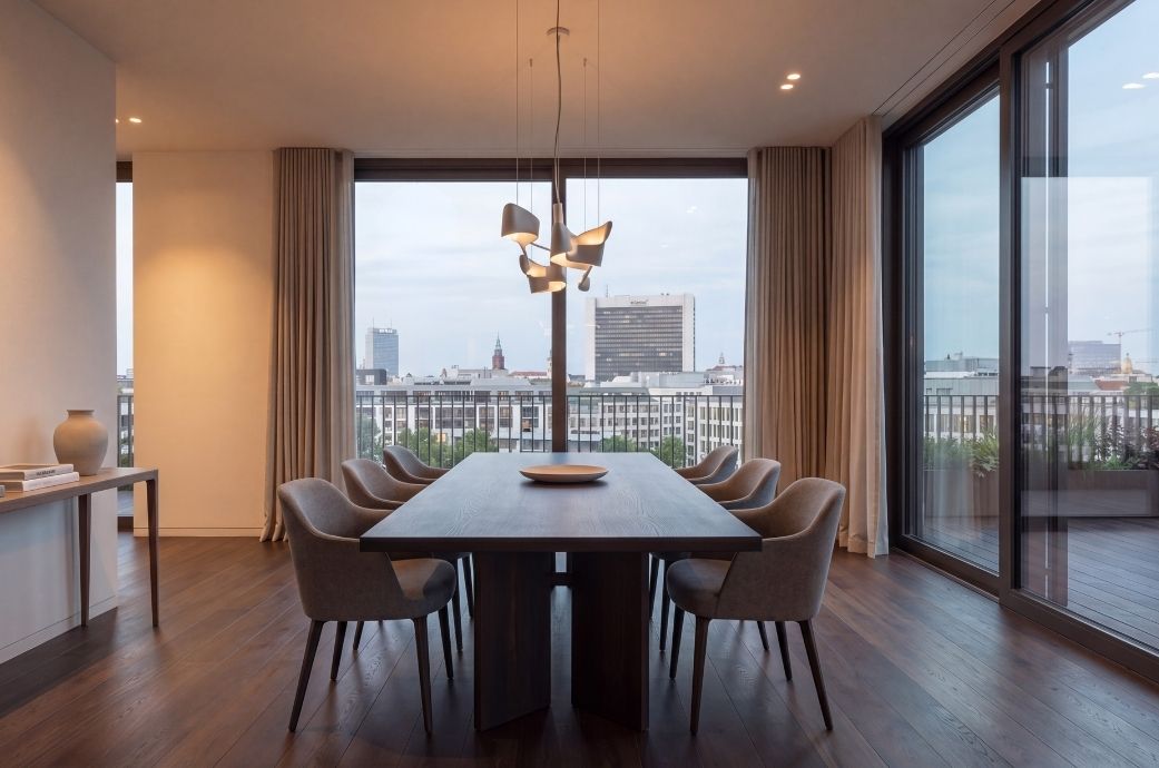 Großflächige Fensterfronten prägen den Raum und schaffen eine direkte Verbindung zur Umgebung. Der Blick über Berlin wird dabei Teil des Wohnkonzepts. Innenraum und Stadt greifen ineinander, ohne an Ruhe zu verlieren.