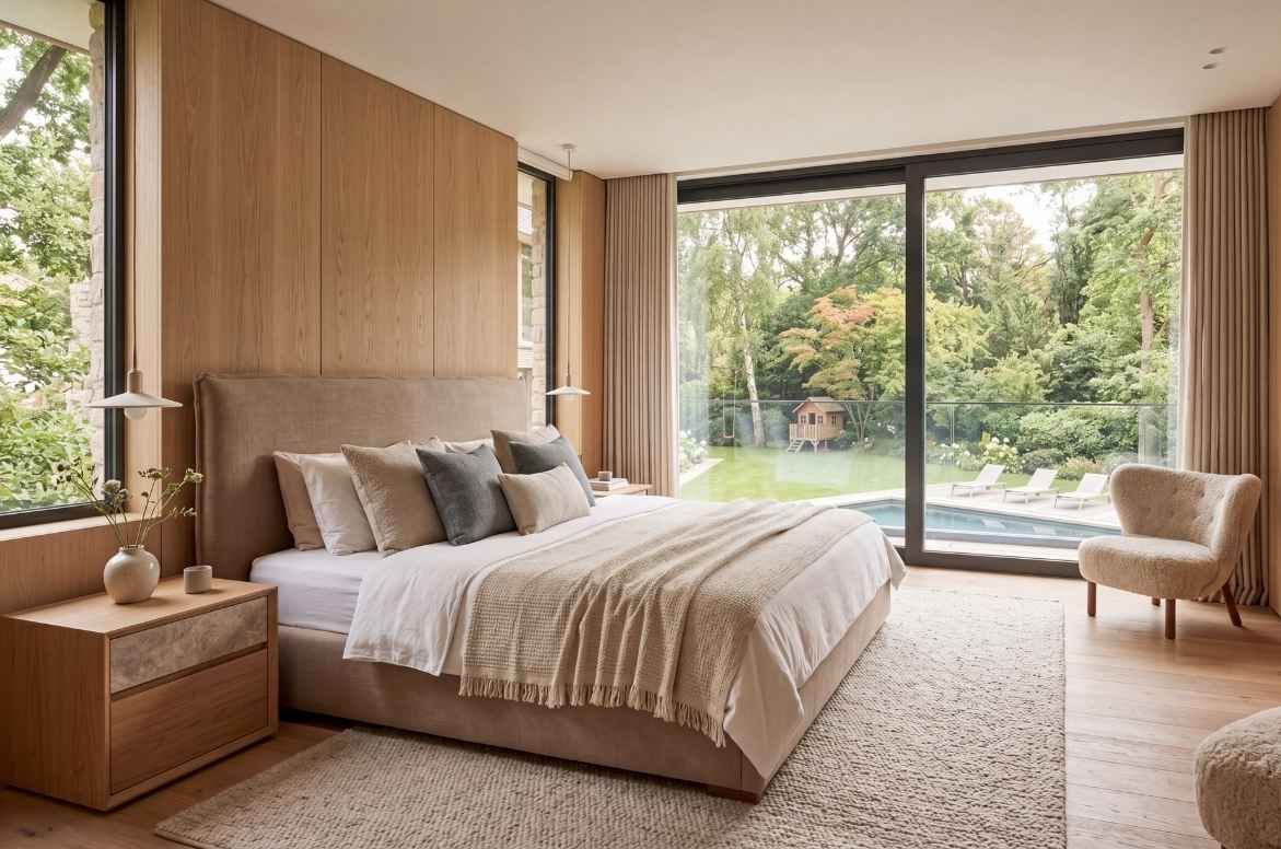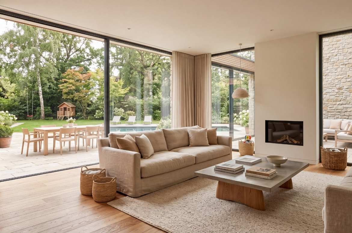 Großzügige Wohnbereiche mit Blick in den Garten, fließende Übergänge zur Terrasse sowie der private Außenbereich mit Pool und altem Baumbestand prägen den Charakter der Immobilie. Das Haus richtet sich an Käufer, die bewusst Wert auf Ruhe, Privatsphäre und architektonische Qualität legen.